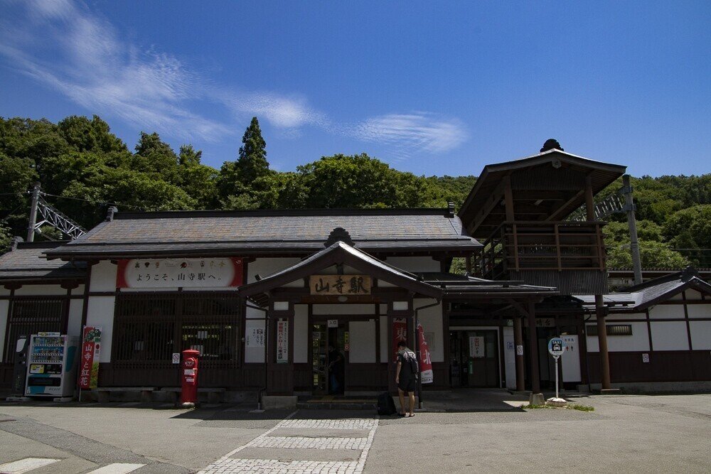 山形駅から仙台に向かう「仙山線」に乗ること約20分で入口の駅「山寺駅」に到着。