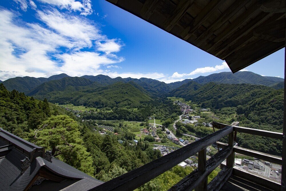 頑張ってのぼったご褒美はこの絶景です。この日の山形は空が美しく日差しがつよかったのですが、五大堂は風通しがよく、汗もひいていきました。